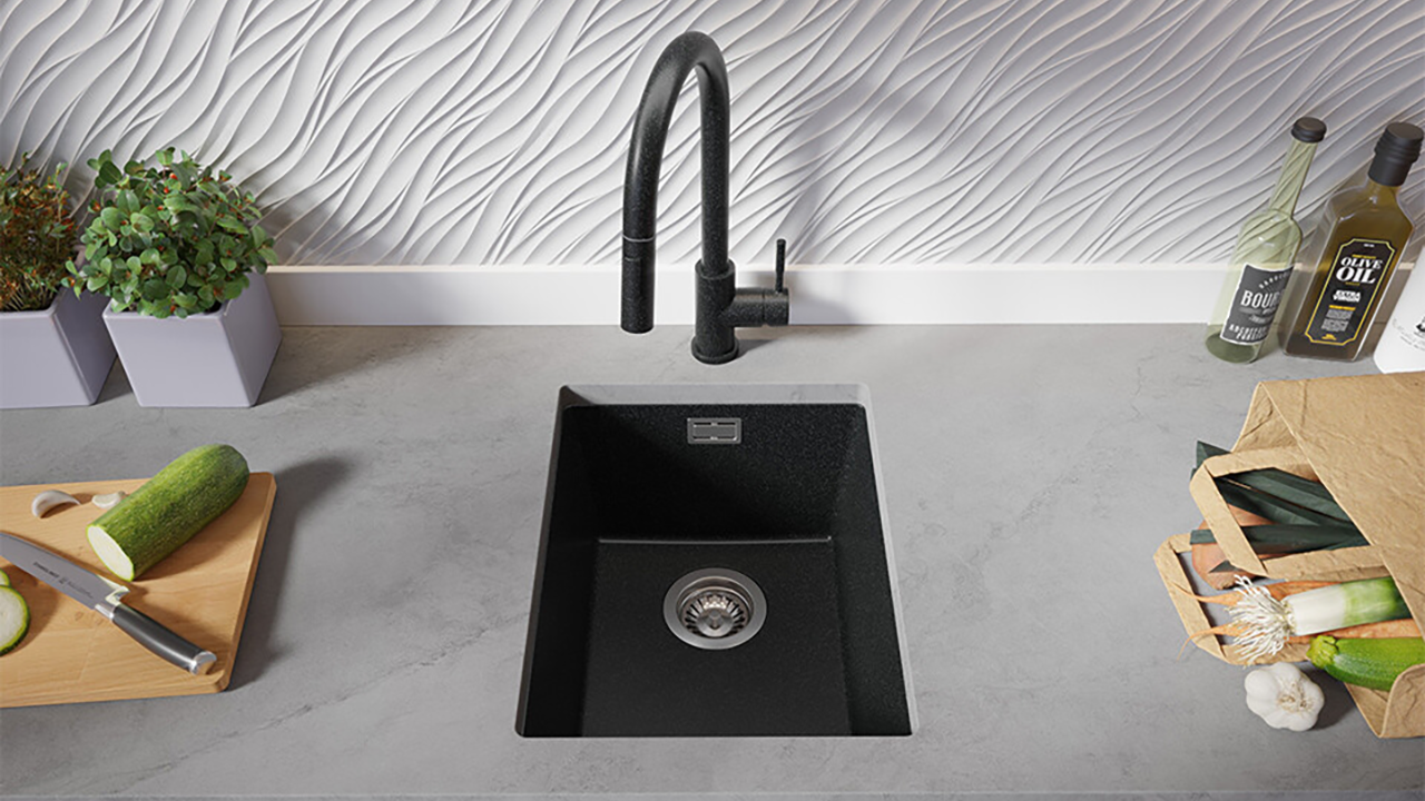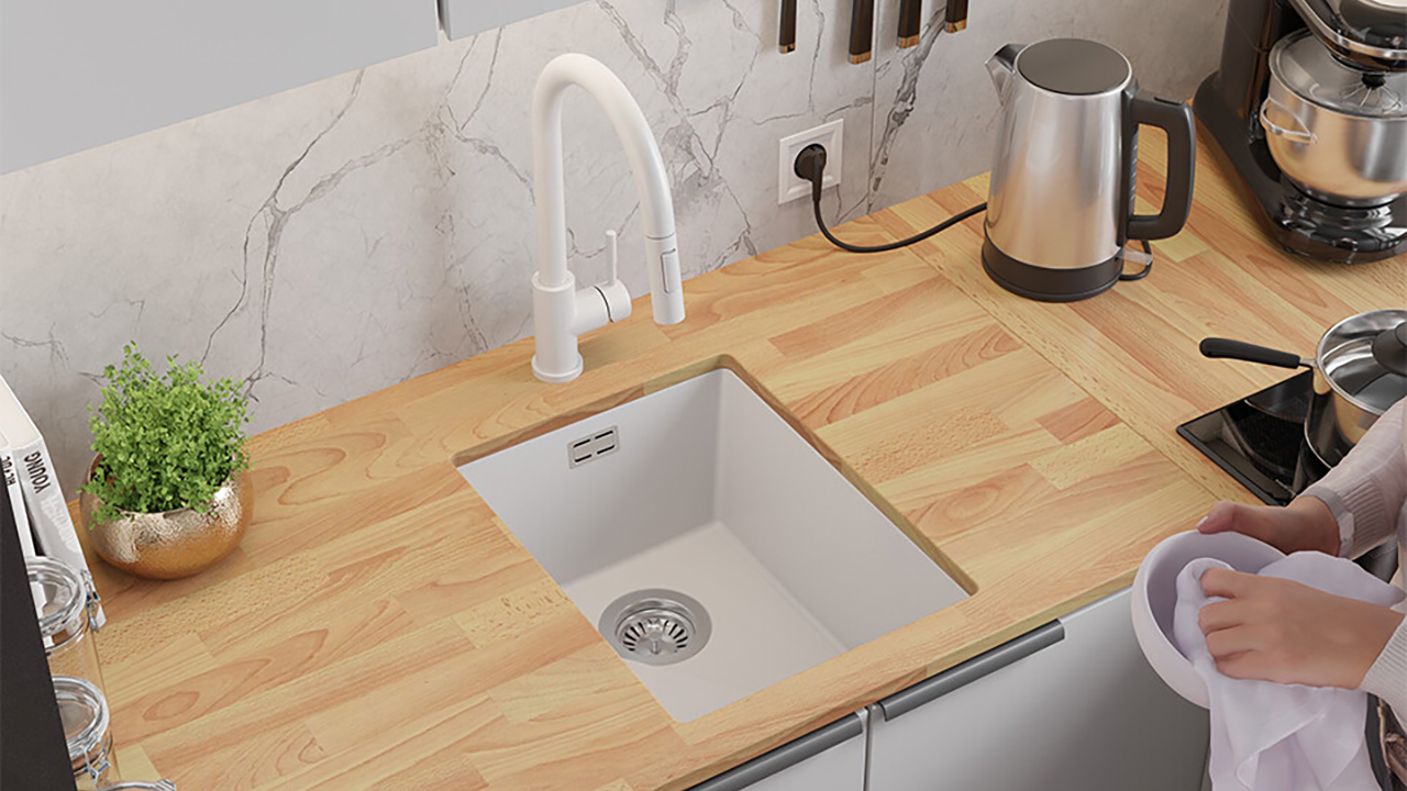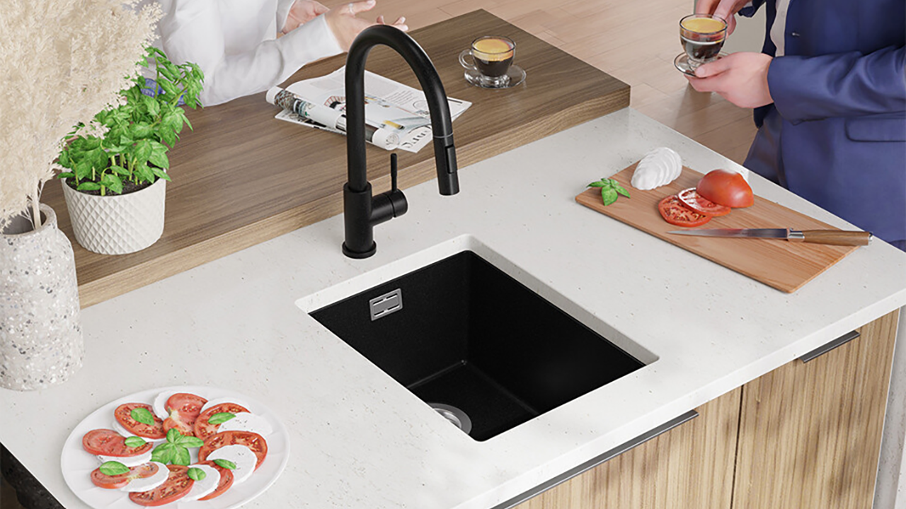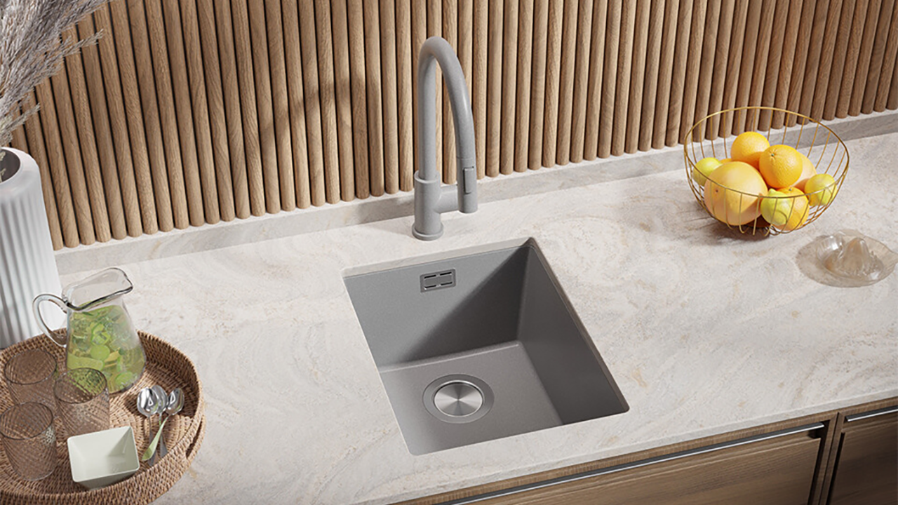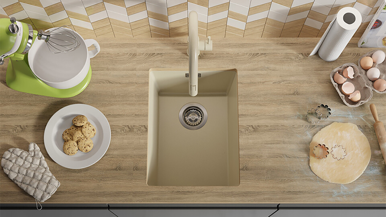 Chiuveta nu se extinde dincolo de blat si – ca una dintre putinele – se potriveste perfect intr-un dulap de 40 cm. Poate fi combinata perfect cu blaturi din piatra si compozit pentru a forma un ansamblu coeziv si elegant. Modelul acesta reprezinta un design minimalist – datorita formei sale dreptunghiulare si lipsei de decoratiuni inutile, este perfect pentru o bucatarie mica, moderna, eleganta. Eleganta clasica care rezulta din simplitate.